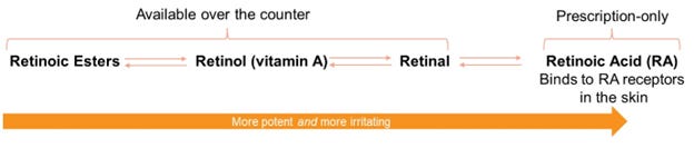 RA gels and creams are available by prescription only, whereas retinol, retinal, and the esters products are all available over the counter. Since retinal needs only one step to convert to RA, it’s more potent and effective than esters or retinol, which need three and two steps, respectively. That can be your guide when choosing which product to use.