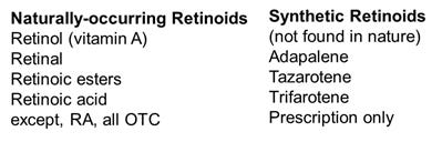 Retinoids are used orally as well as topically for treatment of acne. They are very effective, especially in combination with benzoyl peroxide or antibiotics (here of course, we have to remind our readers of the wonderful vitamin B3, a.k.a. niacinamide. It is comparable to antibiotics and RA in clearing acne. We are of the opinion that antibiotics should be used when needed, but not overused-if you have acne, give vitamin B3 a try first. It might be just as effective without any adverse effects).